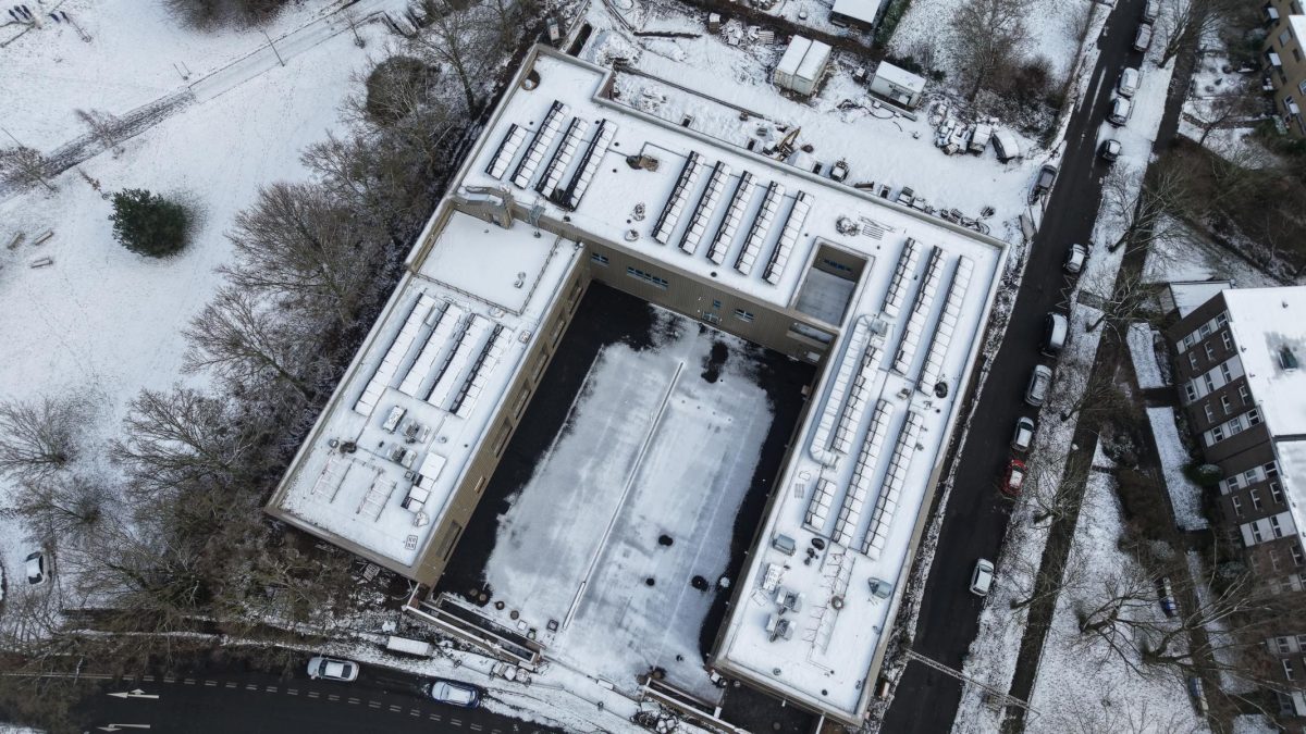 In den letzten Wochen tat sich überall auf der Baustelle so einiges. Fast alle Flächen im Dachbereich wurden mit Substrat befüllt, welches die Grundlage für die spätere Dachbegrünung bildet. Ebenfalls wurde das Ständerwerk für die Photovoltaikanlage installiert und auf diesem auch schon die Solarzellen angebracht. Im Inneren des Gebäudes wurden entsprechende Kabel verlegt, welche vom Dach zu den Wechselrichtern führen. Der Einbau der Lüftungsanlage ging ebenfalls mit großen Schritten vorran und ist mittlerweile fast abgeschlossen. In der Lüftungszentrale im Rettungsdiensttrakt, laufen die letzten Arbeiten. Im Außenbereich wurde begonnen, den Hauptanschluss an das Stromnetz sowie den Anschluss an den Abwasserkanal vorzubereiten.