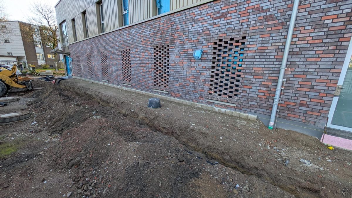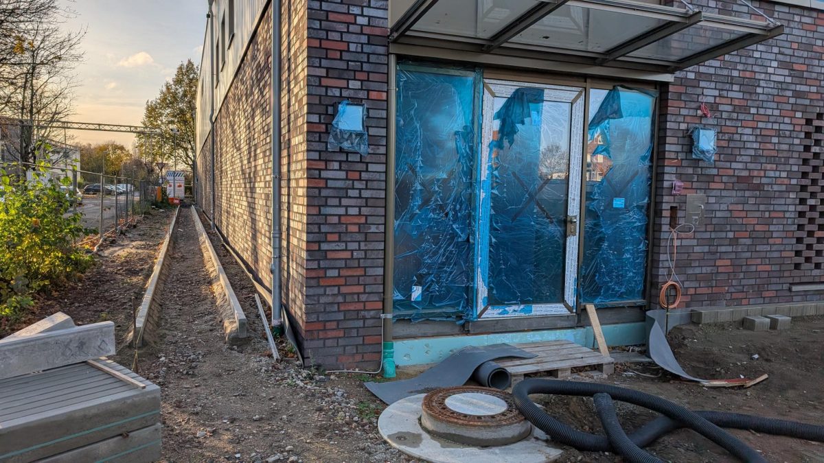 Sehr langsam, aber stetig gehen die Arbeiten auf der Baustelle voran. In den vergangenen 16 Wochen seit unserem letzten Eintrag sind alle Fliesenarbeiten abgeschlossen worden, lediglich einzelne Randsteine oder Ecken fehlen noch. In der Küche wurden weitere Wasserzu- und Ableitungen installiert und anschließend die noch letzte offene Wand mit Rigipsplatten verschlossen. Auch die Rigips-Decken sind mittlerweile fast überall angebracht, so dass diese nun bereit zum Verspachteln und Streichen sind. Die Treppenhäuser und Flure wurden gefliest und die Stufen mit Verkleidung versehen. Im großen Innenhof wurden außen an den Toren sowie mittig entlang die Regenrinnen installiert. Einige Zeit später wurde dann schließlich auch die erste Lage Asphalt aufgebracht. Die zweite Lage ist weiterhin noch ausstehend. Die Elektriker und Heizungsmonteure arbeiten an vielen kleinen Baustellen überall innerhalb des Gebäudes. In einzelnen Bereichen funktioniert aber bereits Strom und Heizung. Im Bereich der zukünftigen Ausfahrt wurden erste Vorkehrungen zur Installation des Rolltores und der Schrankenanlage getroffen. Seitlich vom Gebäude zum Stadtpark hin, wurden erste Pflasterarbeiten durchgeführt. Dort soll die zukünftige Grillecke sowie ein Geräteschuppen und ein Raucherpavillon entstehen.