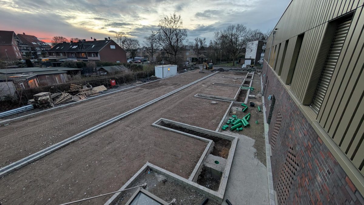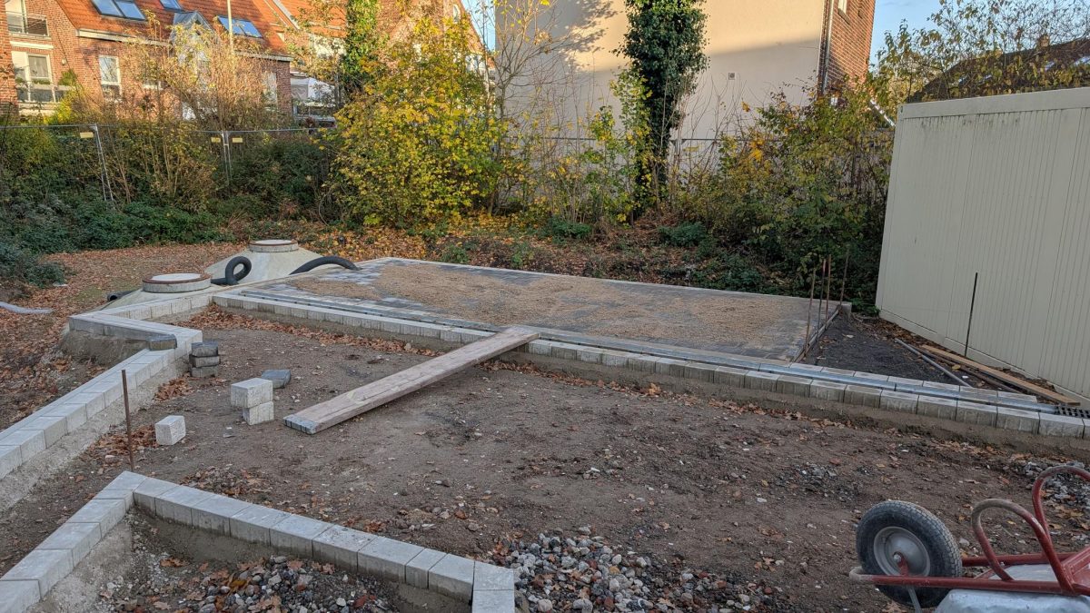 Im Bereich des zukünftigen Parkplatzes hinter dem Gebäude, wurden auf etwa der Hälfte der Fläche die Vorbereitung des Untergrunds abgeschlossen und mit ersten Arbeiten für den zukünftigen Parkplatz begonnen. Dazu wurden vereinzelt Gräben ausgehoben und mit Leerrohren befüllt, durch welche dann Stromleitungen geführt werden. Außerdem wurden erste Randsteine gesetzt. Die Fläche für den zukünftigen Fahrradstellplatz konnte bereits vollständig gepflastert werden. Auf der zweiten Hälfte der Fläche stehen aktuell noch Baucontainer.