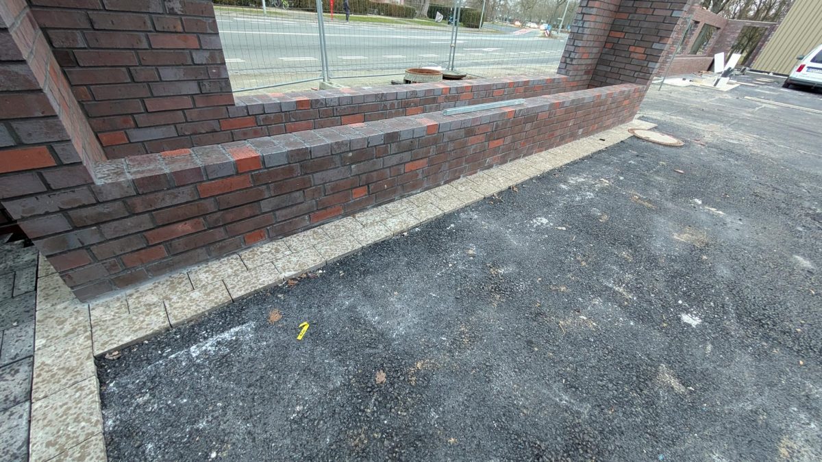 Die Mauer an der Einfahrt zum Innenhof wurde zwischenzeitlich vollständig verklinkert und verfugt und im Asphalt davor wurden elektrische Kontakte zum auslösen der künftigen Schrankenanlage eingebracht.